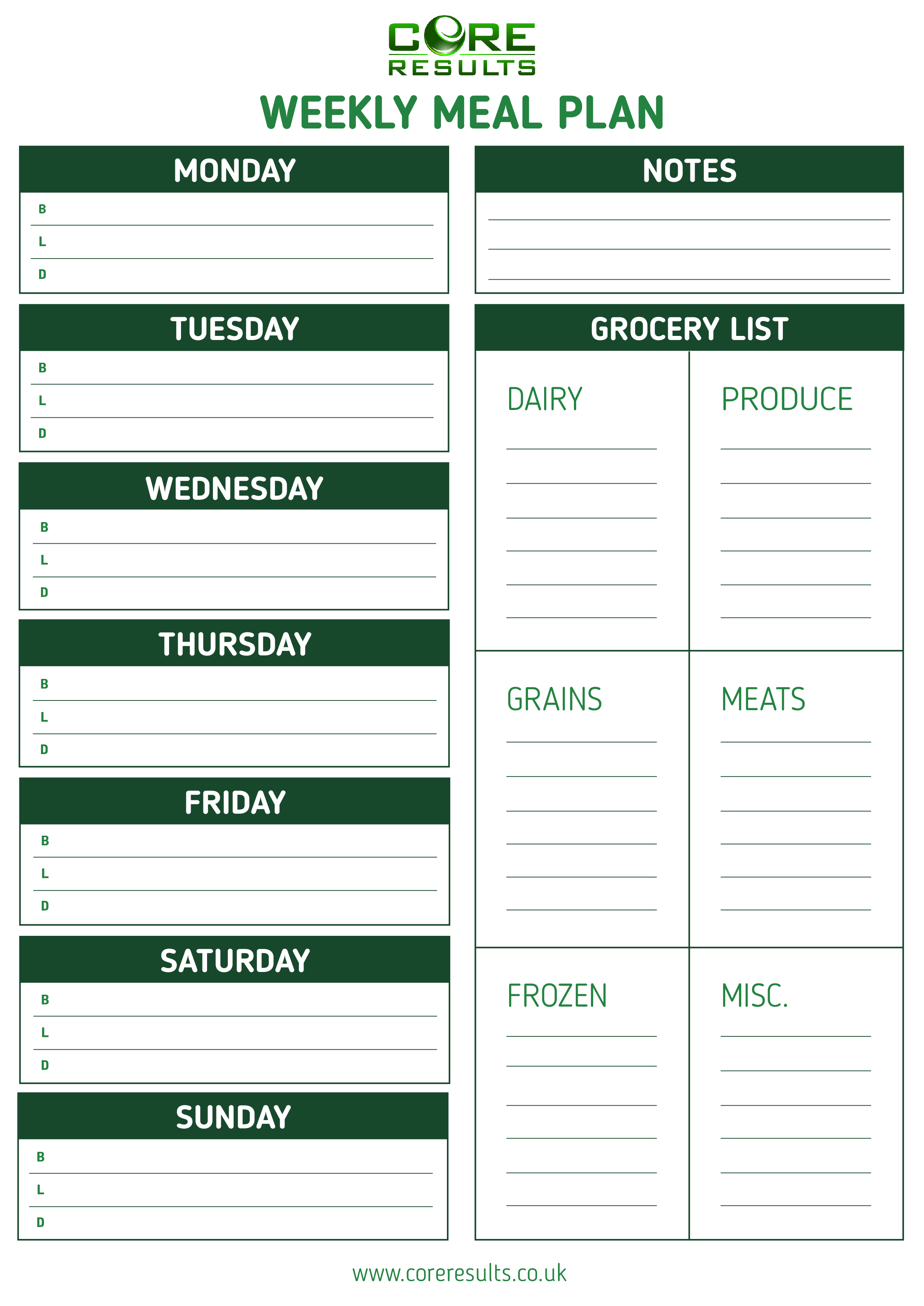 Use a meal plan to jot down your shopping list, recipes and your meal schedule for the week. Download our Core Results meal planner here.